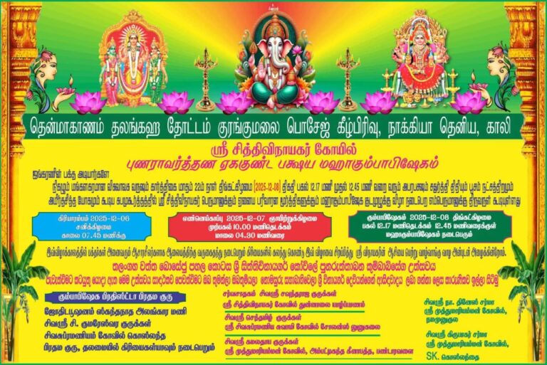 Latest Updates உள்ளூர் செய்திகள் அருள்மிகு ஸ்ரீ சித்தி விநாயகர் ஆலய மகா கும்பாபிஷேகத் திருவிழா November 22, 2025 | 2 months முன்பு