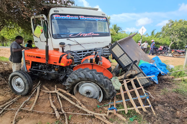 உழவு இயந்திரத்துடன் மோதிய டிப்பர், வீதியில் குறுக்காகத் தடம் புரண்டதில் டிப்பரின் சாரதி சிறு காயங்களுக்குள்ளாகியுள்ளதாக தெரிய வருகின்றது.