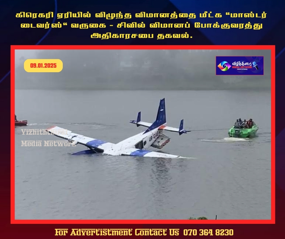 நுவரெலியா ரெலியா கிரெகரி ஏரியில் தரையிறங்கும் போது கடந்த (07) ஆம் திகதி விபத்துக்குள்ளான தனியார் நிறுவனத்திற்குச் சொந்தமான ‘செஸ்னா’ (Cessna) ரக இலகு ரக விமானத்தை மீட்கும் பணிகள் நேற்று (08) முன்னெடுக்கப்பட்டன. சிவில் விமானப் போக்குவரத்து அதிகாரசபையின் அதிகாரிகளின் மேற்பார்வையில் முன்னெடுக்கப்பட்ட இந்த முயற்சி தோல்வியடைந்ததையடுத்து, அதனை மீட்பதற்காக தொழில்முறை சுழியோடிகளின் (Master Divers) சேவையைப் பெற நடவடிக்கை எடுத்துள்ளதாக அதிகாரசபையின் பணிப்பாளர் நாயகம் கப்டன் தமிந்த ரம்புக்வெல்ல தெரிவித்தார்.