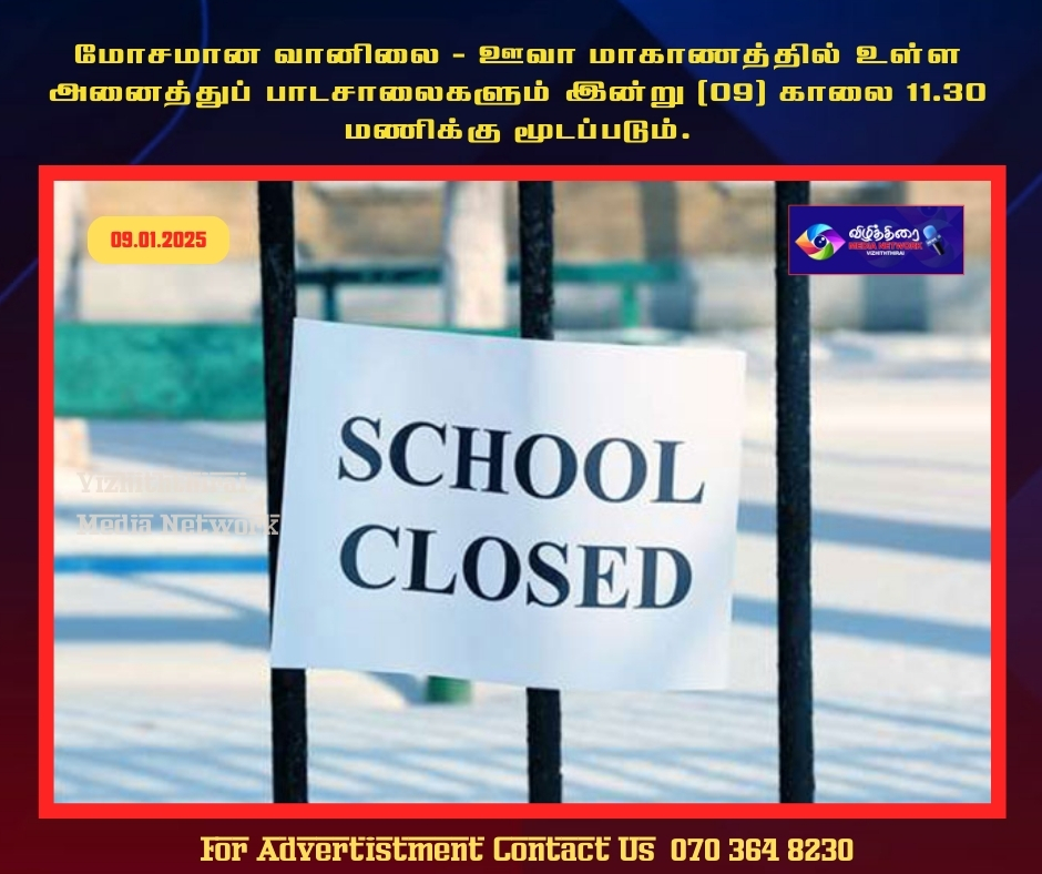நிலவும் மோசமான வானிலை காரணமாக, ஊவா மாகாணத்திலுள்ள அனைத்து பாடசாலைகளும் இன்று (09) முற்பகல் 11.30 மணிக்கு மூடப்படும் என அறிவிக்கப்பட்டுள்ளது. மாணவர்களின் பாதுகாப்பைக் கருத்திற்கொண்டு இந்தத் தீர்மானம் எடுக்கப்பட்டுள்ளது.