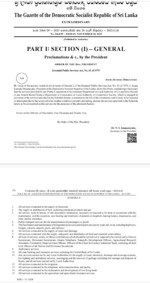 இதன்படி, மின்சார விநியோகம் மற்றும் அதை மீள்நிலைப்படுத்துதல், எரிபொருள் விநியோகம், மருத்துவமனை மற்றும் சுகாதாரப் பாதுகாப்பு சேவைகள், பயணிகள் மற்றும் பொருட்களுக்கான பொது போக்குவரத்து, நீர்வழங்கல் மற்றும் வடிகால் சேவைகள் ஆகியவை அத்தியாவசிய சேவைகளாக அறிவிக்கப்பட்டுள்ளன.