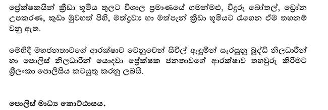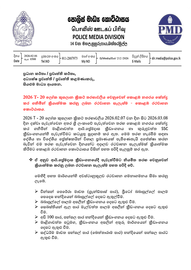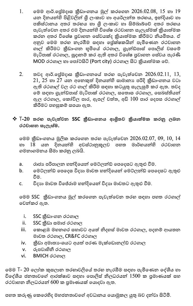 அதன்படி, நாளை (7) முதல் மார்ச் 8 ஆம் திகதி வரை போட்டி நடைபெறும் காலப்பகுதியில், மாளிகாவத்தை ஆர். பிரேமதாச விளையாட்டரங்கம் மற்றும் கறுவாத்தோட்டம் SSC விளையாட்டரங்கம் ஆகியவற்றை அண்டிய பகுதிகளில் இந்தப் போக்குவரத்துத் திட்டம் அமுல்படுத்தப்படும்.