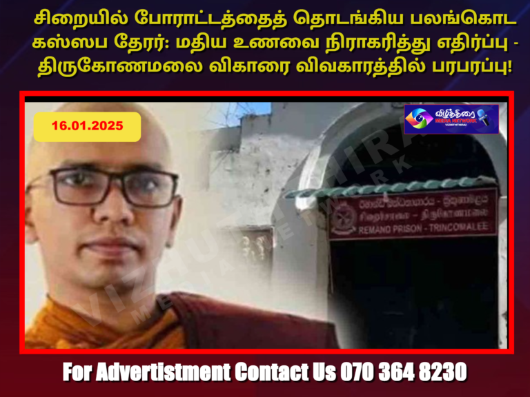 Latest Updates உள்ளூர் செய்திகள் “சிறையில் போராட்டத்தைத் தொடங்கிய பலங்கொட கஸ்ஸப தேரர்: மதிய உணவை நிராகரித்து எதிர்ப்பு – திருகோணமலை விகாரை விவகாரத்தில் பரபரப்பு!” January 16, 2026 | 3 months முன்பு